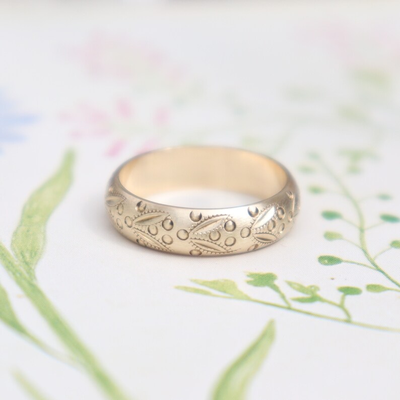 9ct Yellow Gold Wedding Ring 9k Gold Dotty Leaf Engraving Etsy